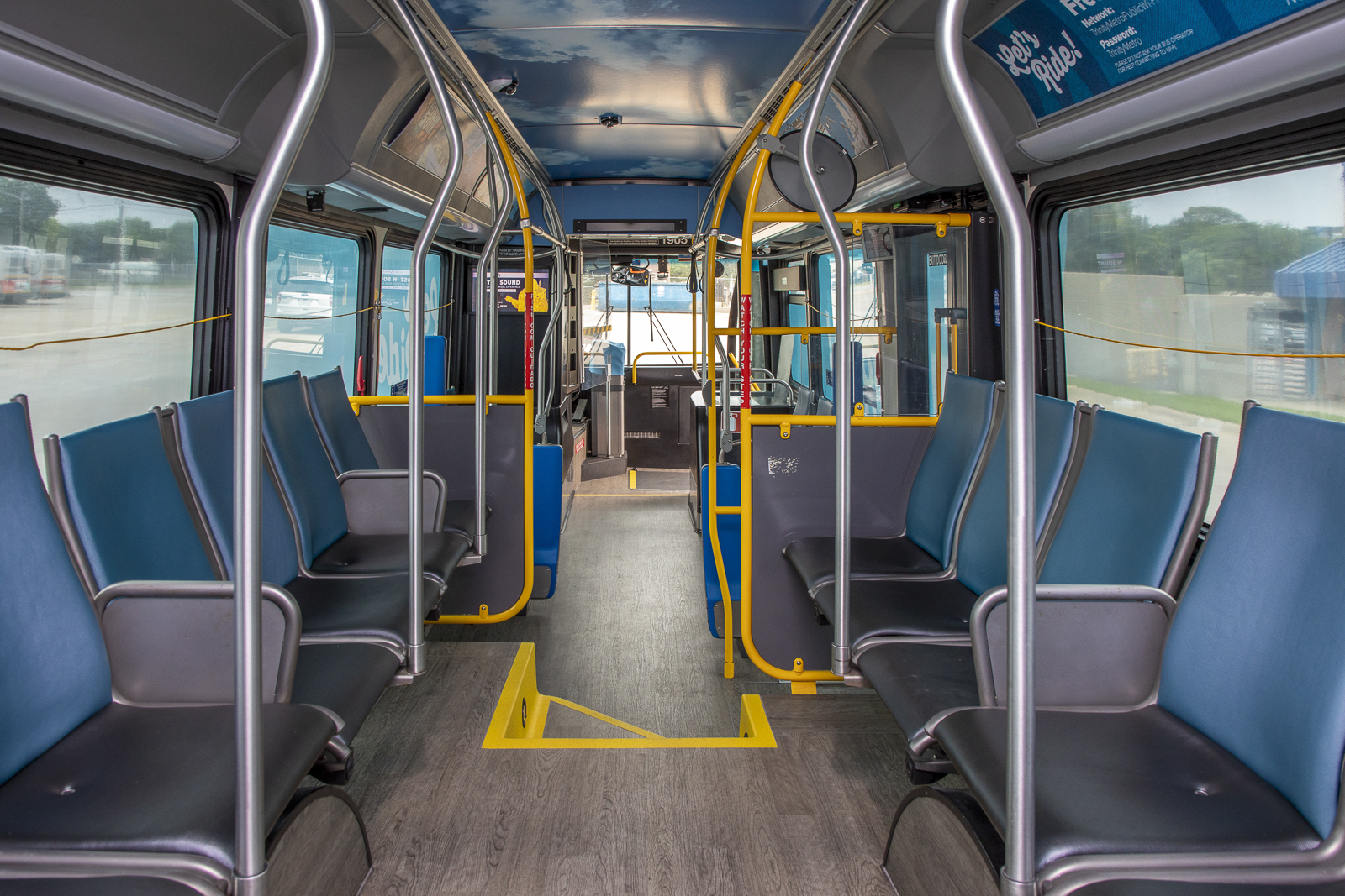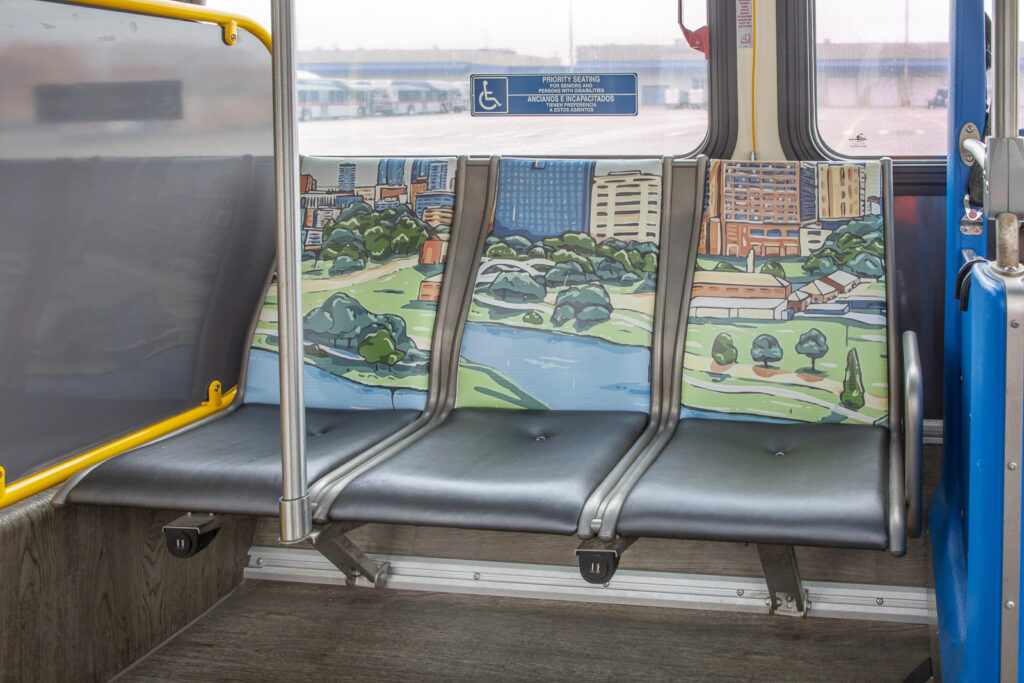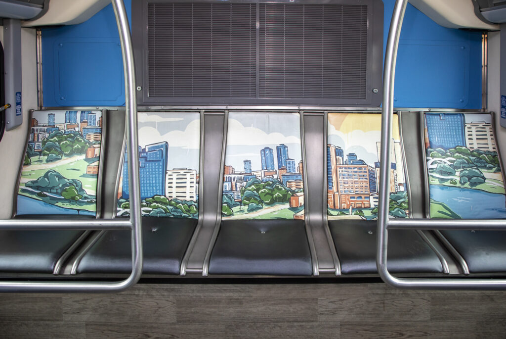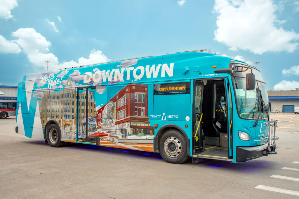 (FORT WORTH, TEXAS) May 27, 2025 —Trinity Metro is excited to announce the launch of the Blue Line, the second of Trinity Metro’s color-coded bus routes, in early June. Visit Fort Worth and Downtown Fort Worth, Inc., are funding partners for the Blue Line, which will help riders travel around downtown. Passengers will enjoy a sleek new riding experience around downtown in bright blue buses with iconic artwork on the exterior. Once aboard the bus, they’ll enjoy comfortable perimeter seating with additional artwork inside and on selected seats.