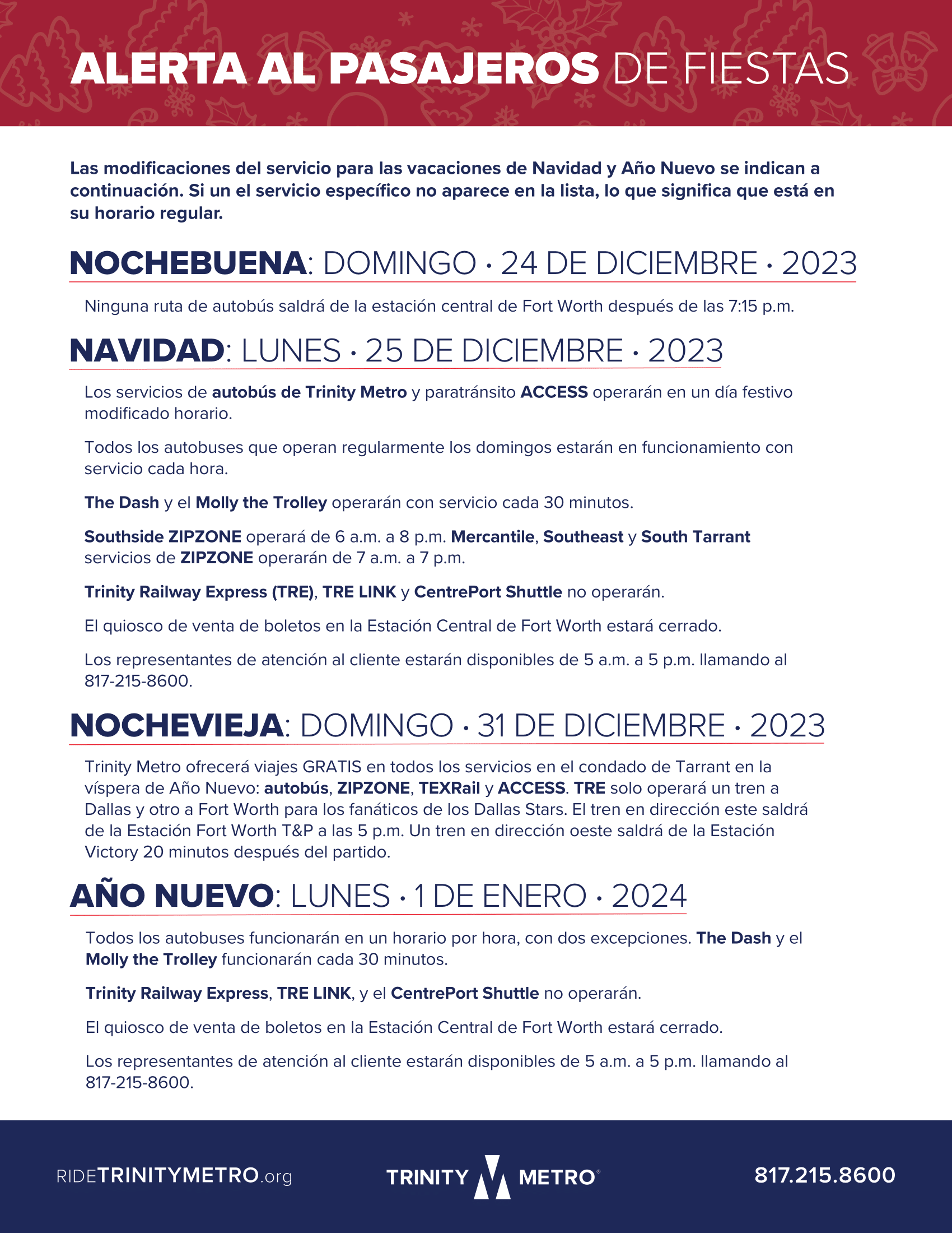 The Christmas and New Year’s Day holidays are coming up, and we’ve got some service adjustments planned. Trinity Metro bus and ACCESS paratransit services will operate on a modified holiday schedule. The full details are below. Questions? Call 817-215-8600.