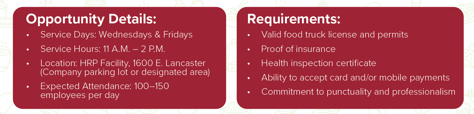 Trinity Metro is looking to partner with local food trucks to provide a variety of delicious lunch options for our employees on-site. This is a great opportunity to showcase your menu, grow your customer base, and be part of a vibrant workplace community. Fill out the form below and we’ll get in touch with you!