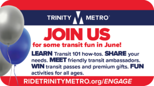 Trinity Metro is hosting 6 community events in June to learn more about what our customers and community needs from its transit system. LEARN everything you’ve always wanted to know about your transit services. SHARE what you need and want from your transit services.