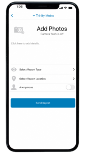 The Transit Security Feature within the GoPass app is a convenient option for customers to provide information about Trinity Metro’s rail, bus, bus stops, stations, and transfer centers. The app gives our customers the ability to report safety and security concerns, and other suspicious activities while riding Trinity Metro’s bus, TEXRail, and TRE services. Help us maintain a safe environment for Trinity Metro customers and employees by remembering that if you see something, say something.